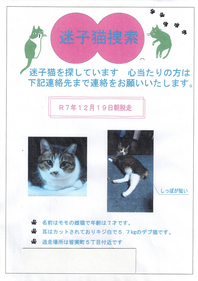 ぽっちゃり・キジ白・耳カットあり・しっぽが短いなどが特徴です。
